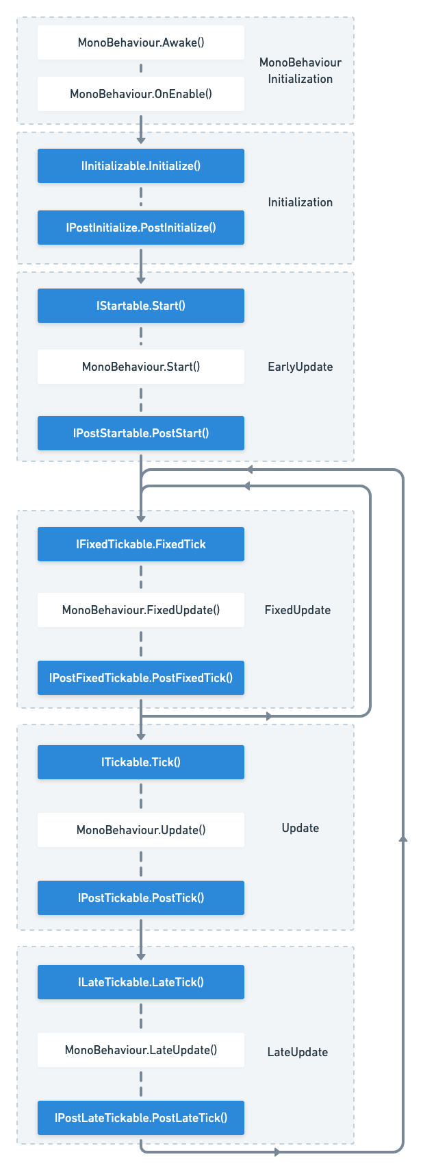 IPostFixedTickable.PostFixedTick()After MonoBehaviour.FixedUpdate()